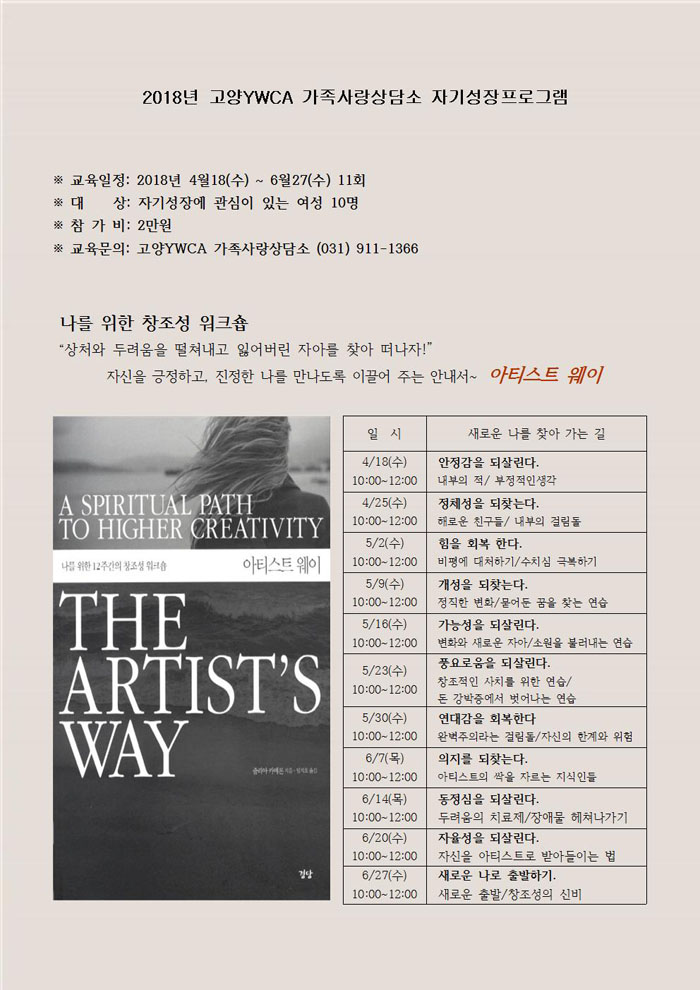 2018년 가족사랑상담소 자기성장프로그램-아티스트웨이 페이지 정보 작성자 고양YWCA 댓글 0건 조회 2,176회 작성일 18-04-11 09:53 목록 본문 페이스북 공유 트위터 공유 구글+ 공유 나를 위한 창조성 워크숍-아티스트 웨이에 초대합니다. '상처와 두려움을 떨쳐내고 잃어버린 자아를 찾아 떠나자' 자신을 긍정하고 진정한 나를 만나도록 이끌어주는 안내서 - 아티스트 웨이 자세한 사항은 첨부파일을 참조하세요~ 댓글 0 댓글목록 등록된 댓글이 없습니다.