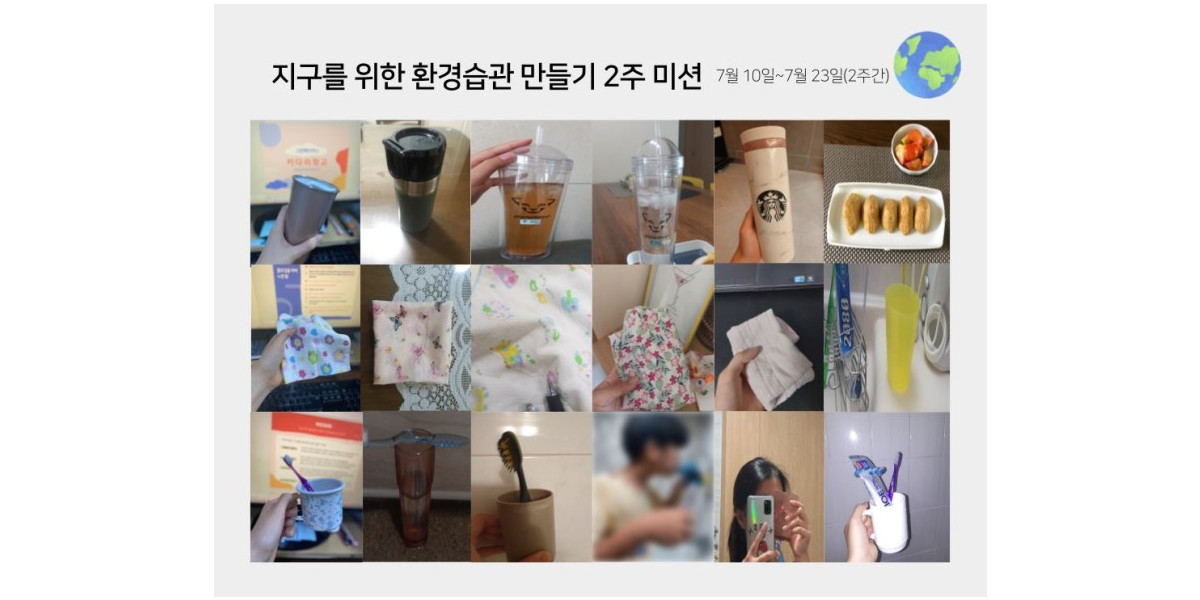 우리는 '그린메이커스' 지난 7월 2주동안 키다리학교 참가자들이 환경미션을 진행했습니다.[텀블러 사용하기, 채식하기, 손수..