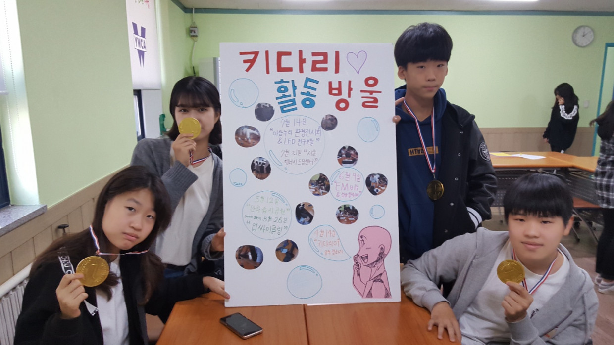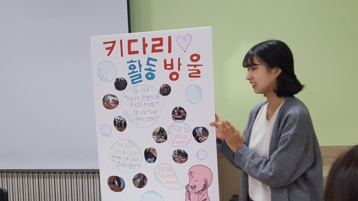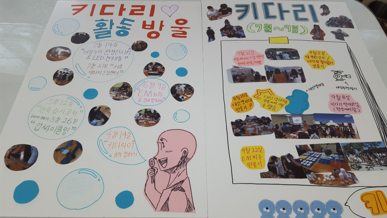 1. EM비누와 실리콘 컵 판넬 2. 환경보호 판넬 3. 키다리활동 판넬 (4~6월) 4. 키다리활동 판넬 (7~9월) 로 총 4팀이 4개의 판넬을 제작했답니다. 나눔행사에서 보여드릴 판넬을 조별로 제작하며 창의성, 전달력, 디자인이 뛰어난 '판넬 왕팀'을 뽑는 시간도 가졌습니다!