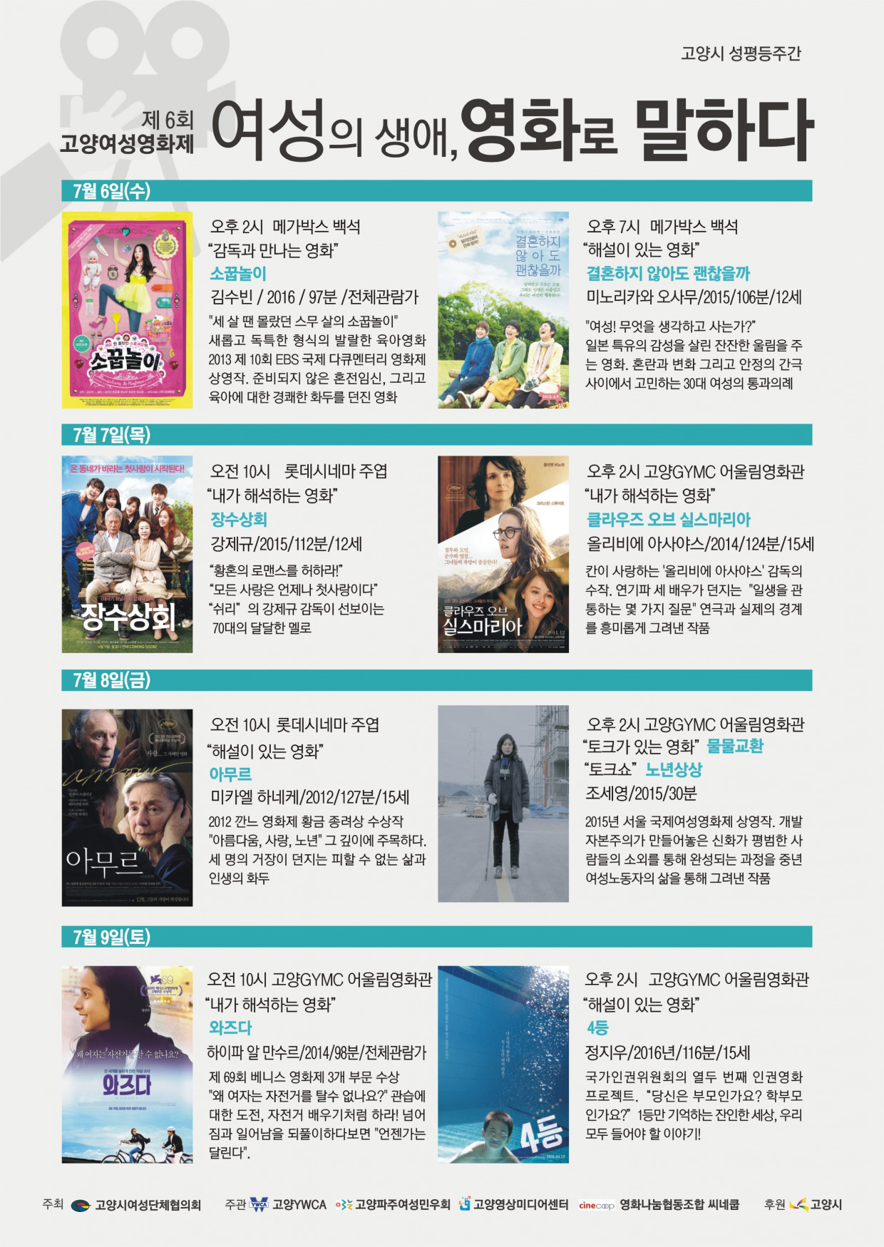제 6회 고양여성영화제가 7/6(수) ~ 7/9(토)까지 백석메가박스, 롯데시네마 주엽, 고양GYMC 어울림영화관에서