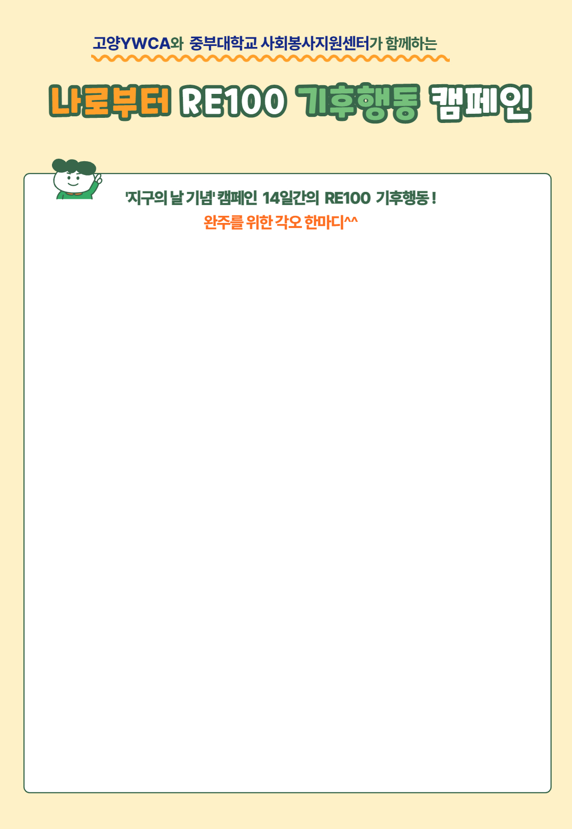 4월 22일 지구의 날을 맞이하여 기후위기의 심각성을 인식하고, 저탄소생활 실천의 필요성을 알리는 기후행동 캠페인을 진행합니다. '나로부터 RE100' 우리 함께 해요~!
