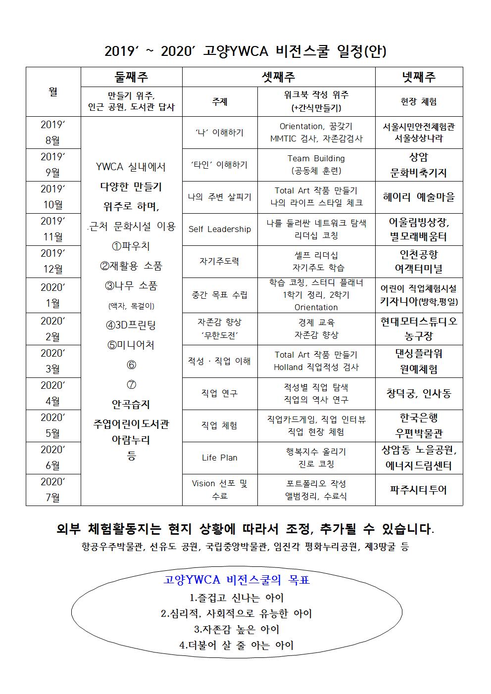 고양YWCA는 2012년부터 아동비전형성서비스 - 꿈 찾기 비전스쿨을 진행해오고 있습니다.