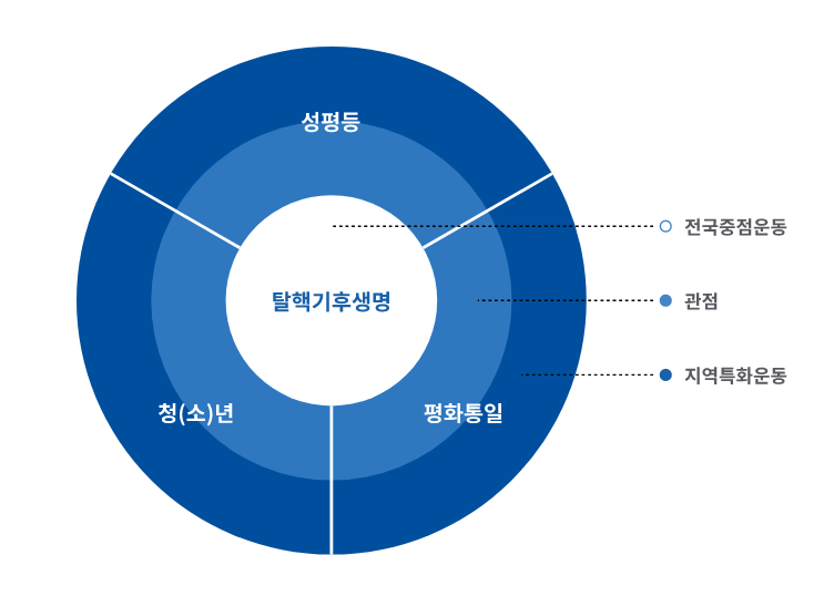 한국YWCA는 청(소)년, 성평등, 평화의 관점을 반영한 탈핵기후생명운동을 중점운동으로 하고, 회원YWCA 및 권역별로는 각 지역 상황에 적합한 특화운동을 추진함으로써, 전국과 지역이 따로 또 같이 자치와 자율, 연대와 협력으로 유기적인 방식을 통해 운동을 전개합니다.